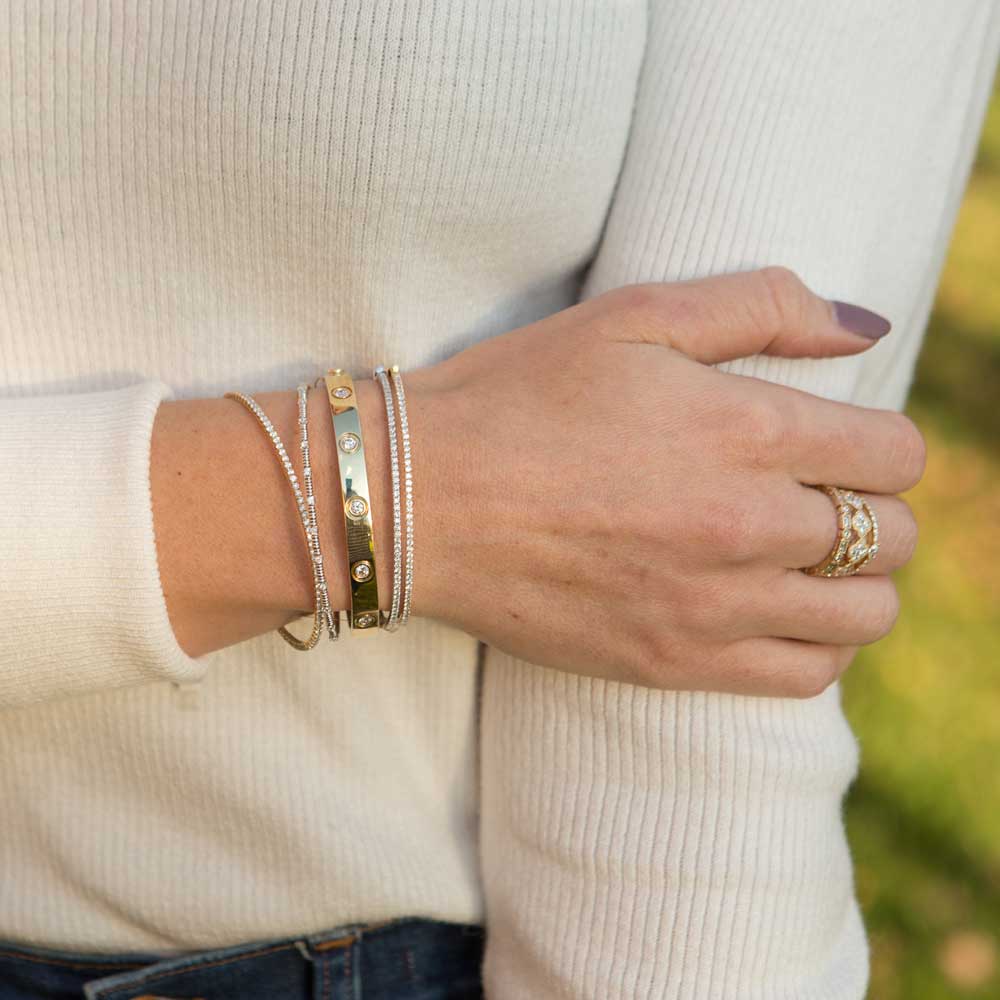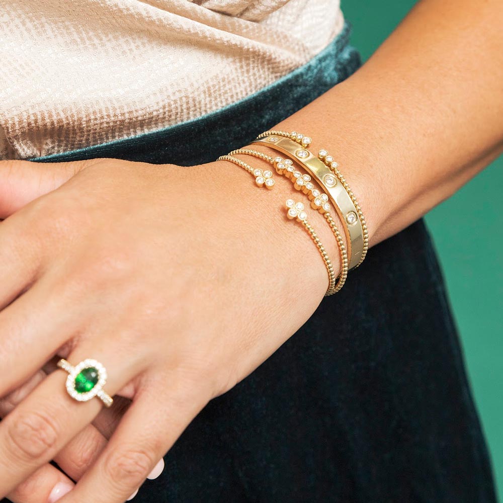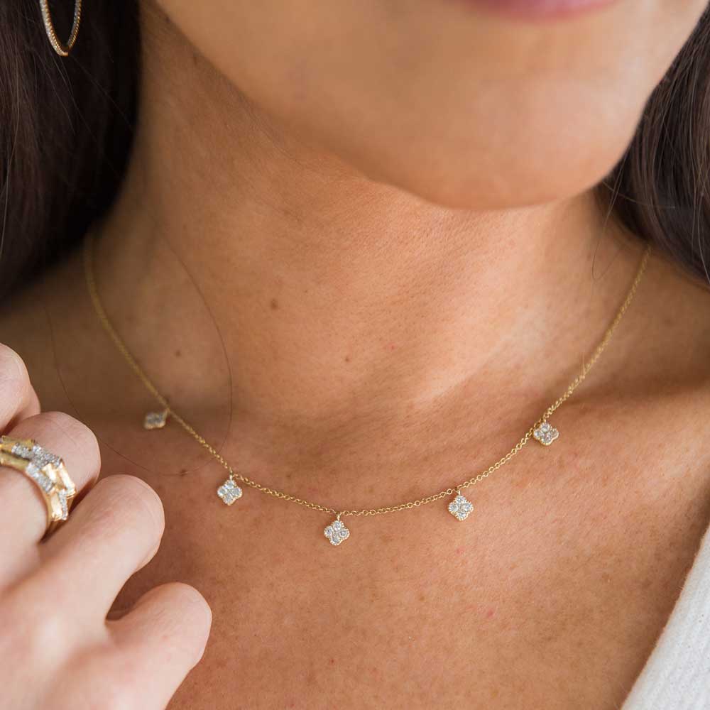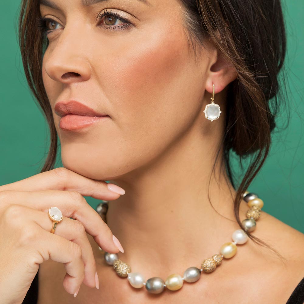 18K Yellow Gold Diamond Ring and Earrings, both with Clear Quartz Over White Mother of Pearl. Paired with an 18 inch strand of 23 South Sea and Tahitian baroque pearls individually knotted on a silk cord with pink gold and champagne diamond stations.