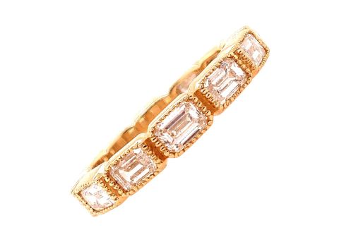 This 14K yellow gold diamond ring features nine emerald cut diamonds bezel set along three quarters of the ring. The total diamond weight of the ring is approximately 2.24 carats.