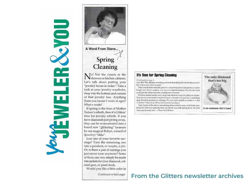 If spring is the time of Mother Nature’s rebirth, then it’s Glitters’ time for jewelry rebirth. If you have diamonds just pining away, they can be re-incarnated into a brand new “glittering” treasure by our magical Robyn, wizard of (jewelry) “ahhs.”