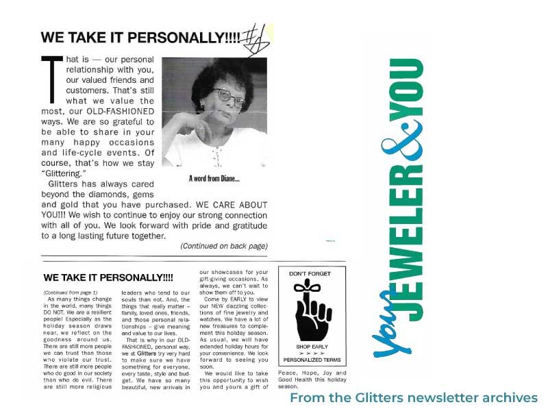 That is – our personal relationship with you, our valued friends and customers. That’s still what we value the most, our OLD-FASHIONED ways. We are so grateful to be able to share in your many happy occasions and life-cycle events. Of course, that’s how we stay “Glittering.”