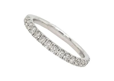 This 14K white gold diamond band features seventeen round brilliant diamonds set along the top of the ring. The total diamond weight of the band is .35 carat.